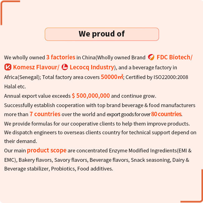 ما بیش از 4000 محصول غذایی از جمله طعم دهنده ها، تثبیت کننده ها برای لبنیات و آب میوه، پروبیوتیک ها، شربت های غلیظ شده و بهبود دهنده های تغذیه ای ارائه می دهیم.